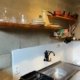 A cozinha possui fogão, geladeira, sanduicheira, liquidificador, panelas, pratos, talheres, copos, xícaras e uma bancada para refeições